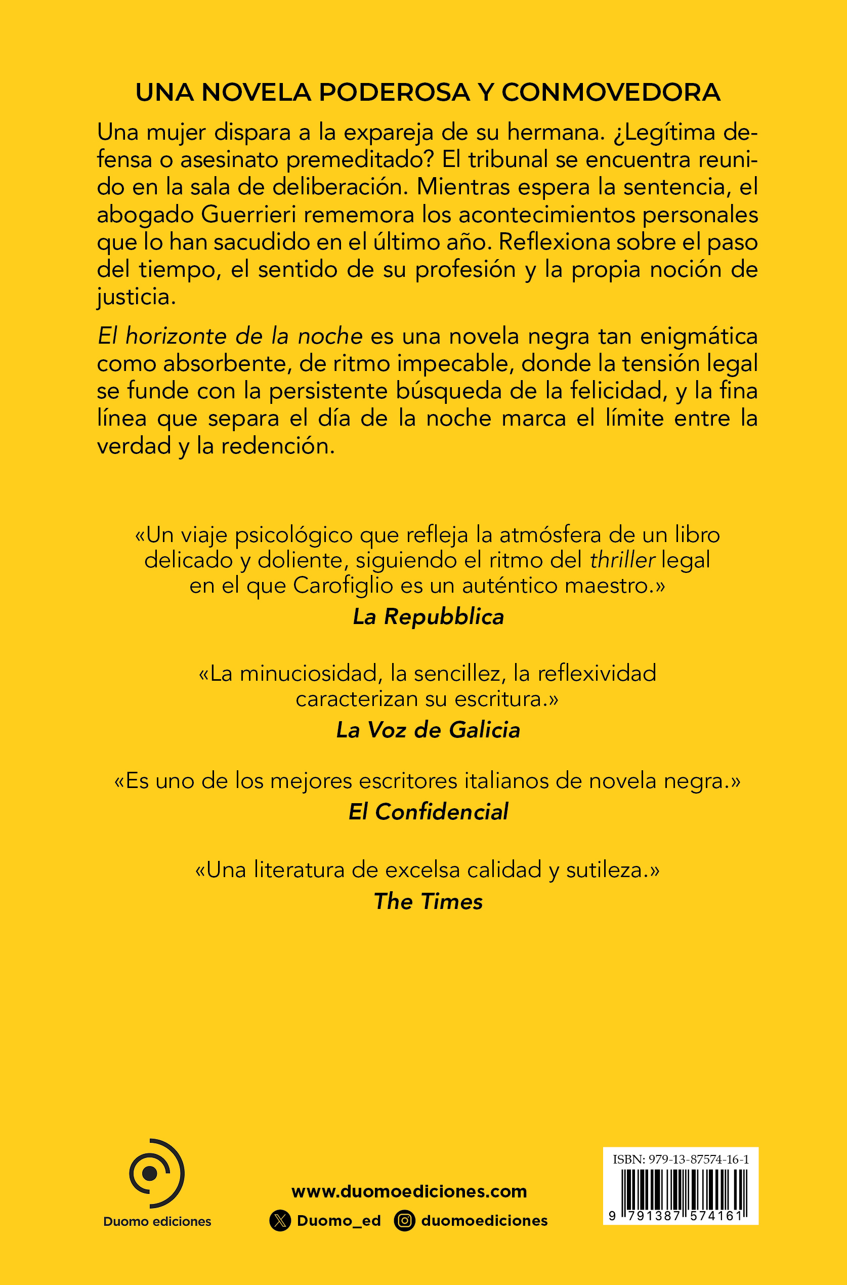 El horizonte de la noche es una novela negra tan enigmática como absorbente, de ritmo impecable, donde la tensión legal se funde con la persistente búsqueda de la felicidad, y la fina línea que separa el día de la noche marca el límite entre la verdad y la redención.