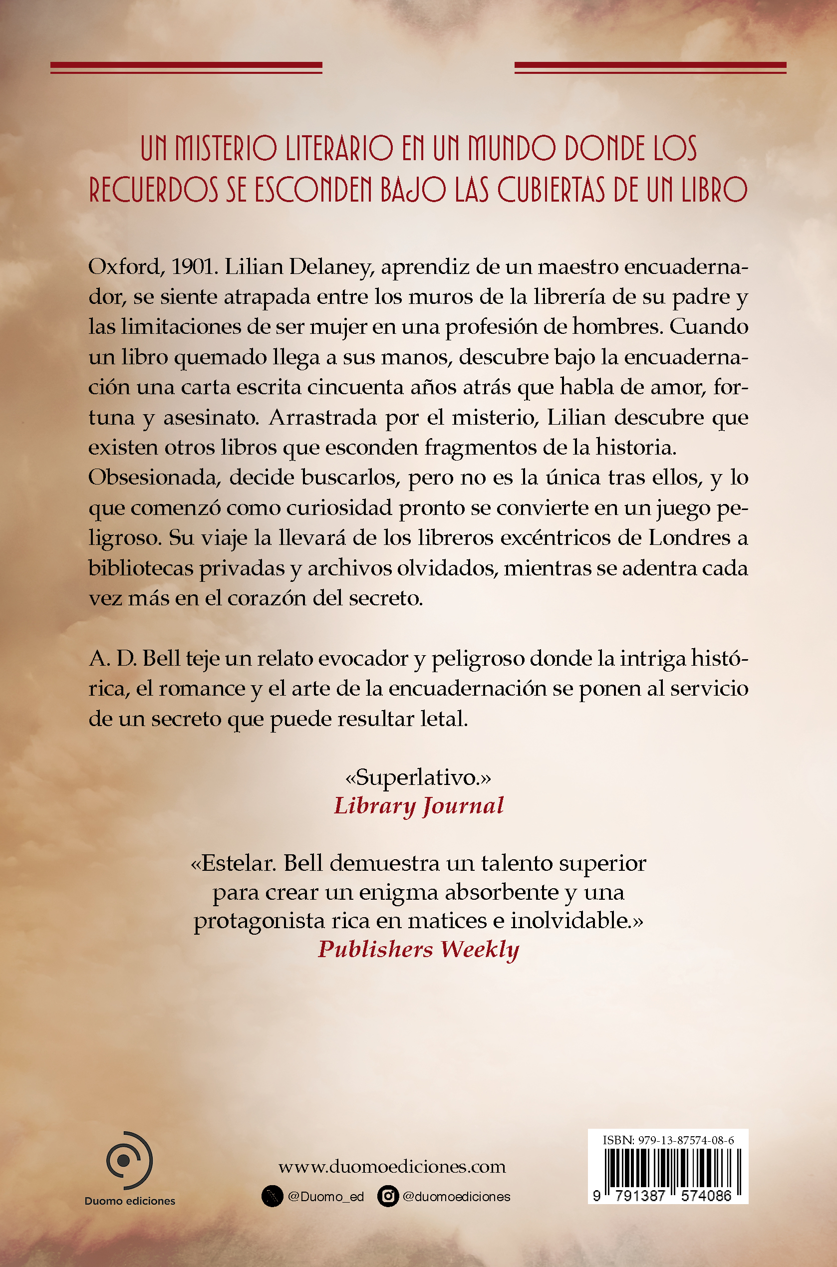 Oxford, 1901. Lilian Delaney, aprendiz de un maestro encuadernador, se siente atrapada entre los muros de la librería de su padre y las limitaciones de ser mujer en una profesión de hombres. Cuando un libro quemado llega a sus manos, descubre bajo la encuadernación una carta escrita cincuenta años atrás que habla de amor, fortuna y asesinato. Arrastrada por el misterio, Lilian descubre que existen otros libros que esconden fragmentos de la historia. Obsesionada, decide buscarlos, pero no es la única tras ellos, y lo que comenzó como curiosidad pronto se convierte en un juego peligroso. Su viaje la llevará de los libreros excéntricos de Londres a bibliotecas privadas y archivos olvidados, mientras se adentra cada vez más en el corazón del secreto. A. D. Bell teje un relato evocador y peligroso donde la intriga histórica, el romance y el arte de la encuadernación se ponen al servicio de un secreto que puede resultar letal.